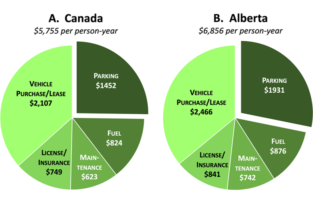 All values are from Statistics Canada (Table: 11-10-0222-01) except the cost of parking which is estimated in the Transition Accelerator study by calculating the embedded costs of parking associated with residential, commercial, and institutional facilities.